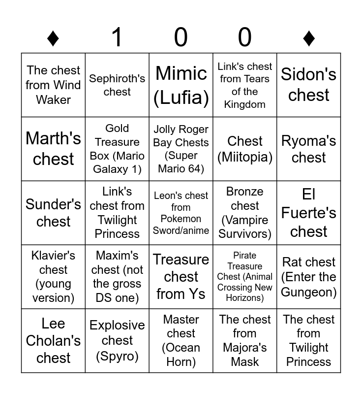 This bingo card has 75 words: Mimic (Dragon Quest), Ken's chest, Mimic (Lufia), Geralt's chest, Lockup (Banjo Kazooie), Kazuichi Soda's chest, The chest from Okami, Tracey Sketchit's chest, Black chest (Thousand Year Door), Tusk's chest, The chest from Twilight Princess, Shulk's chest, Jolly Roger Bay Chests (Super Mario 64), Marth's chest, Ice Chest (Banjo- Tooie), Link's chest from Twilight Princess, Mimicutie (Kid Icarus Uprising), Leon's chest from Pokemon Sword/anime, Plunder Chest (Mario Party), Sidon's chest, The chest from Link's Awakening, Sunder's chest, Gold Treasure Box (Mario Galaxy 1), Sephiroth's chest, Link's chest from Tears of the Kingdom, Cursed Treasure Chest (Luigi Mansion 3), Mitsurgui's chest, Treasure Chest from Kirby and the Rainbow Curse, Gladiolus's chest, Treasure Chest (Donkey Kong Country 2), Raiden's chest, Treasure Chest from Ufouria, Fierce Deity Link's chest, Pirate Treasure Chest (Animal Crossing New Horizons), Ryoma's chest, Chest (Miitopia), Takumi's chest, Treasure chest from Octopath Traveller, El Fuerte's chest, The chest from Majora's Mask, Tidus's chest, The chest from Ocarina of Time, Bayonetta's chest, The chest from Skyward Sword, Ghirahim's chest, Treasure chest from Shovel Knight, Lee Cholan's chest, The chest from Wind Waker, Wii Fit Trainer Male's chest, The chest from A Link to the Past, Dante's chest, Treasure chest from Ys, Chrom's chest, The chest from Zelda II, Terry Bogard's chest, The chest from Mario Party 1, John Marston's chest, Secret Chest (Zak and Wiki), Frank West's chest, Tricky Treasure (Rayman Legends), Maxim's chest (not the gross DS one), Prismatic chest (Tunic), Male Ring Fit Trainer's chest, Treasure chest from Ring Fit Adventure, Mia Fey’s chest, Bronze chest (Vampire Survivors), Partito's chest, The chest from Minecraft, Kanbei's chest, Rat chest (Enter the Gungeon), Klavier's chest (young version), Explosive chest (Spyro), Hwoarang's chest, Master chest (Ocean Horn) and Adol Christin's chest.