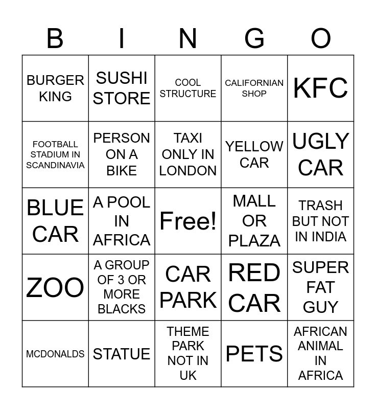 This bingo card has a free space and 24 words: A GROUP OF 3 OR MORE BLACKS, STATUE, TAXI ONLY IN LONDON, MCDONALDS, KFC, BURGER KING, FOOTBALL STADIUM IN SCANDINAVIA, SUSHI STORE, MALL OR PLAZA, CAR PARK, YELLOW CAR, BLUE CAR, RED CAR, SUPER FAT GUY, PERSON ON A BIKE, PETS, TRASH BUT NOT IN INDIA, COOL STRUCTURE, UGLY CAR, A POOL IN AFRICA, AFRICAN ANIMAL IN AFRICA, ZOO, CALIFORNIAN SHOP and THEME PARK NOT IN UK.