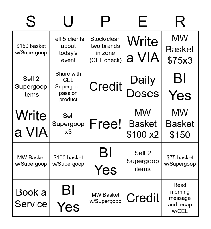 This bingo card has a free space and 24 words: $100 basket w/Supergoop, BI Yes, Credit, Book a Service, MW Basket $75x3, $150 basket w/Supergoop, Sell 2 Supergoop items, Tell 5 clients about today's event, MW Basket $100 x2, BI Yes, Daily Doses, Write a VIA, Sell 2 Supergoop items, $75 basket w/Supergoop, Share with CEL Supergoop passion product, Credit, MW Basket $150, Stock/clean two brands in zone (CEL check), BI Yes, Sell Supergoop x3, Read morning message and recap w/CEL, MW Basket w/Supergoop, Write a VIA and MW Basket w/Supergoop.