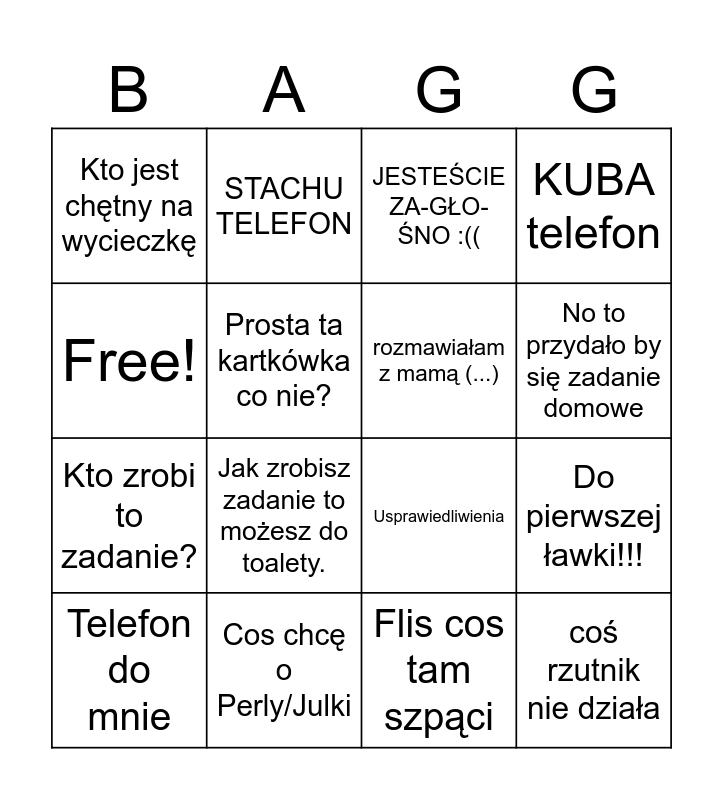 This bingo card has 16 words: Cos chcę o Perly/Julki, Do pierwszej ławki!!!, JESTEŚCIE ZA-GŁO-ŚNO :((, Kto jest chętny na wycieczkę, Kto zrobi to zadanie?, STACHU TELEFON, Usprawiedliwienia, Flis cos tam szpąci, Free!, Prosta ta kartkówka co nie?, Telefon do mnie, KUBA telefon, Jak zrobisz zadanie to możesz do toalety., No to przydało by się zadanie domowe, rozmawiałam z mamą (...) and coś rzutnik nie działa.
