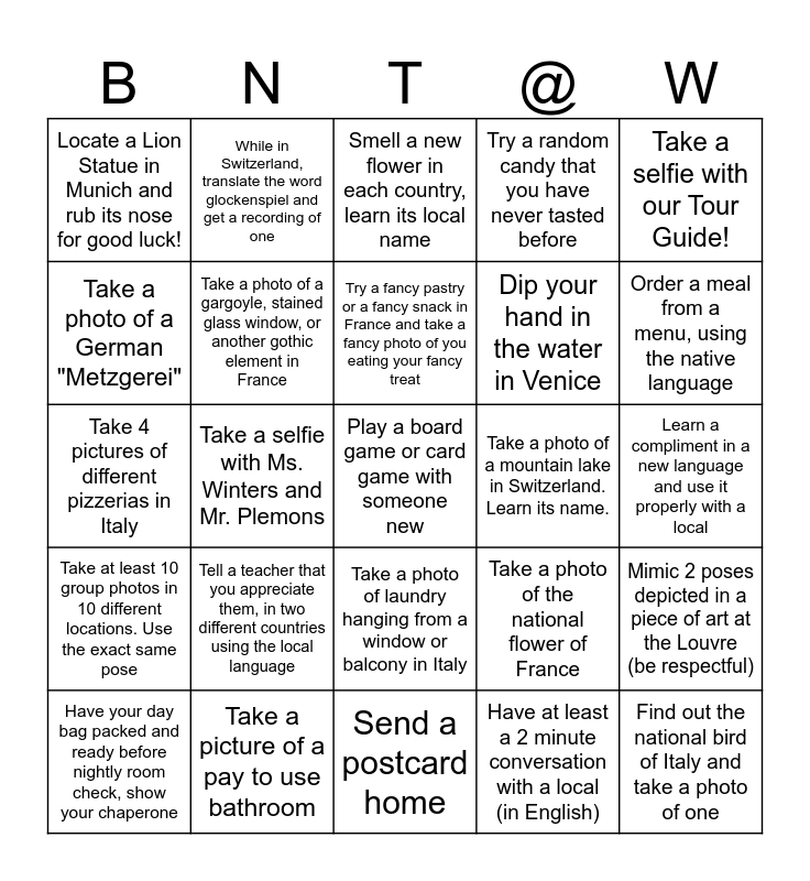 This bingo card has 25 words: Tell a teacher that you appreciate them, in two different countries using the local language, Send a postcard home, Try a fancy pastry or a fancy snack in France and take a fancy photo of you eating your fancy treat, Have your day bag packed and ready before nightly room check, show your chaperone, Take a selfie with our Tour Guide!, Locate a Lion Statue in Munich and rub its nose for good luck!, Take a photo of a German "Metzgerei", While in Switzerland, translate the word glockenspiel and get a recording of one, Take a photo of a mountain lake in Switzerland. Learn its name., Take a photo of laundry hanging from a window or balcony in Italy, Dip your hand in the water in Venice, Take 4 pictures of different pizzerias in Italy, Take a photo of the national flower of France, Mimic 2 poses depicted in a piece of art at the Louvre (be respectful), Take a photo of a gargoyle, stained glass window, or another gothic element in France, Find out the national bird of Italy and take a photo of one, Learn a compliment in a new language and use it properly with a local, Smell a new flower in each country, learn its local name, Order a meal from a menu, using the native language, Take a selfie with Ms. Winters and Mr. Plemons, Play a board game or card game with someone new, Take a picture of a pay to use bathroom, Take at least 10 group photos in 10 different locations. Use the exact same pose, Try a random candy that you have never tasted before and Have at least a 2 minute conversation with a local (in English).