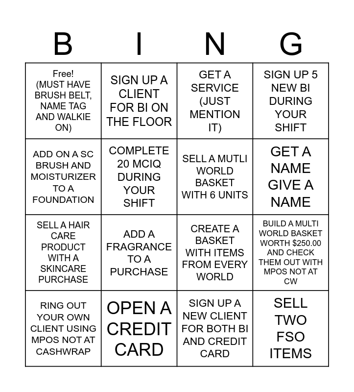 This bingo card has 16 words: RING OUT YOUR OWN CLIENT USING MPOS NOT AT CASHWRAP, OPEN A CREDIT CARD, GET A SERVICE (JUST MENTION IT), SIGN UP 5 NEW BI DURING YOUR SHIFT, ADD ON A SC BRUSH AND MOISTURIZER TO A FOUNDATION, SIGN UP A CLIENT FOR BI ON THE FLOOR, CREATE A BASKET WITH ITEMS FROM EVERY WORLD, BUILD A MULTI WORLD BASKET WORTH $250.00 AND CHECK THEM OUT WITH MPOS NOT AT CW, Free! (MUST HAVE BRUSH BELT, NAME TAG AND WALKIE ON), COMPLETE 20 MCIQ DURING YOUR SHIFT, SIGN UP A NEW CLIENT FOR BOTH BI AND CREDIT CARD, GET A NAME GIVE A NAME, SELL A HAIR CARE PRODUCT WITH A SKINCARE PURCHASE, ADD A FRAGRANCE TO A PURCHASE, SELL A MUTLI WORLD BASKET WITH 6 UNITS and SELL TWO FSO ITEMS.