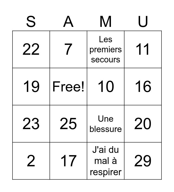 This bingo card has 48 words: 1, 2, 3, 4, 5, 6, 7, 8, Free!, 9, 10, 11, 12, 13, 14, 15, 16, 17, 18, 19, 20, 21, 22, 23, 24, 25, 26, 27, 28, 29, À l'aide !, Appelez la police !, J'ai besoin d'un médecin, Pouvez-vous appeler une ambulance?, Les premiers intervenants, Je suis allergique à…, Je me sens faible, J'ai du mal à respirer, Ma localité est…, Être en train d’accoucher, Perdre connaissance, Crise cardiaque, Les premiers secours, Un pansement, Une blessure, Compressions thoraciques, Onguent antibiotique and Béquilles.