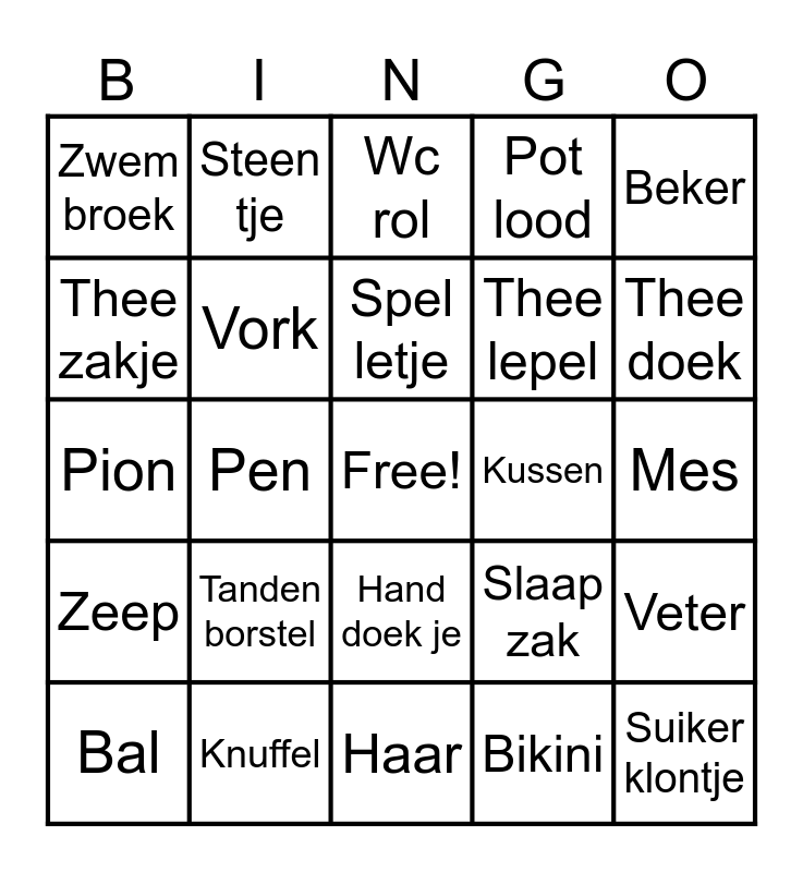 This bingo card has a free space and 56 words: Stoel, Bal, Lepel, Zwem broek, Haar, Onder broek, Vork, Sham poo, Thee lepel, Slipper, Pot lood, Bril, Riem, Koekje, Tas, Emmer, Beker, Pen, Zonne bril, Suiker klontje, Kussen, Tanden borstel, Slaap zak, Wc rol, Zak lamp, Spel letje, T shirt, Stuk fruit, Thee doek, Borstel, Plak band, Blaadje, Hagel slagje, Snoepje, Mes, Thee zakje, Pion, Trui, Zeep, Steen tje, Hand doek je, Zonne brand crème, Boek, Hoofd deksel, Munt, Tanden borstel, Knuffel, Takje, Haar elas tiekje, Water flesje, Bikini, Bord, Tennis racket, Horloge, Veter and Papier.