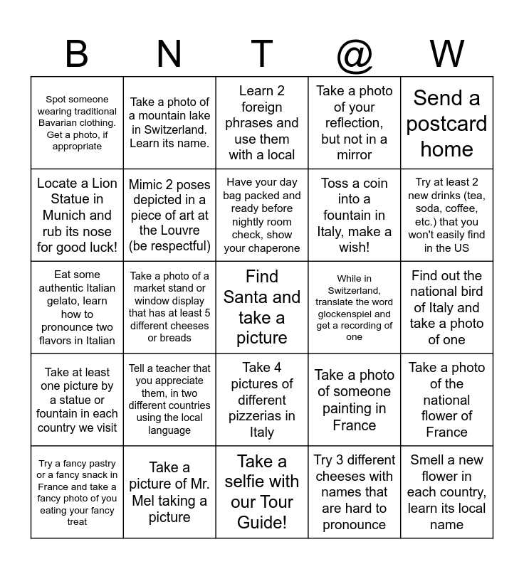 This bingo card has 25 words: Tell a teacher that you appreciate them, in two different countries using the local language, Take a selfie with our Tour Guide!, Have your day bag packed and ready before nightly room check, show your chaperone, Try a fancy pastry or a fancy snack in France and take a fancy photo of you eating your fancy treat, Send a postcard home, Spot someone wearing traditional Bavarian clothing. Get a photo, if appropriate, Locate a Lion Statue in Munich and rub its nose for good luck!, Take a photo of a mountain lake in Switzerland. Learn its name., While in Switzerland, translate the word glockenspiel and get a recording of one, Take 4 pictures of different pizzerias in Italy, Toss a coin into a fountain in Italy, make a wish!, Eat some authentic Italian gelato, learn how to pronounce two flavors in Italian, Take a photo of someone painting in France, Take a photo of the national flower of France, Mimic 2 poses depicted in a piece of art at the Louvre (be respectful), Smell a new flower in each country, learn its local name, Find out the national bird of Italy and take a photo of one, Learn 2 foreign phrases and use them with a local, Try at least 2 new drinks (tea, soda, coffee, etc.) that you won't easily find in the US, Take a photo of a market stand or window display that has at least 5 different cheeses or breads, Find Santa and take a picture, Take a picture of Mr. Mel taking a picture, Take at least one picture by a statue or fountain in each country we visit, Take a photo of your reflection, but not in a mirror and Try 3 different cheeses with names that are hard to pronounce.
