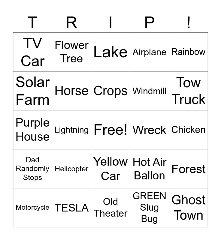 This bingo card has a free space and 34 words: Cow, GREEN Slug Bug, Ram Truck, Anti-Trump Flag, Dad Randomly Stops, Horse, Rainbow, Motorcycle, Flower Tree, Semi, Crops, Lake, Snow, Eagle, Wreck, Tow Truck, TESLA, Purple House, Helicopter, Hot Air Ballon, Yellow Car, Springfield, TV Car, Chicken, Old Theater, Ghost Town, Airplane, Exotic Animal, Windmill, Solar Farm, Pride Flag, Lightning, Forest and Cactus.