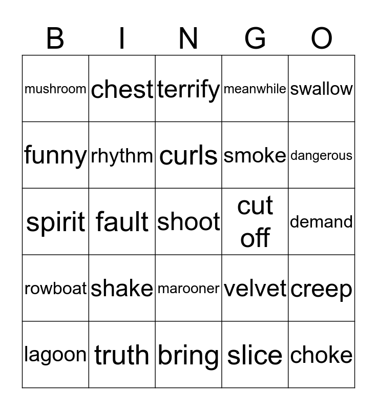 This bingo card has 47 words: gather, shoot, strike, bring, shake, kneel, chest, hurt, funny, fun, rhythm, meanwhile, creep, velvet, lace, iron hook, curls, cut off, tasty, swallow, fault, slice, mushroom, smoke, giggle, dangerous, lagoon, sparkle, marooner, rowboat, prisoner, chief, tide, untie, ahoy, truth, demand, moan, ghost, haunt, choke, terrify, spirit, creature, nest, float and obey.