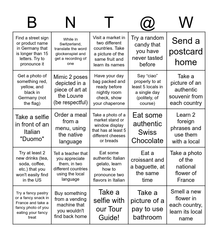This bingo card has 25 words: Tell a teacher that you appreciate them, in two different countries using the local language, Take a selfie with our Tour Guide!, Have your day bag packed and ready before nightly room check, show your chaperone, Try a fancy pastry or a fancy snack in France and take a fancy photo of you eating your fancy treat, Send a postcard home, Find a street sign or product name in Germany that is longer than 15 letters. Try to pronounce it, Get a photo of something red, yellow, and black in Germany (not the flag), While in Switzerland, translate the word glockenspiel and get a recording of one, Eat some authentic Swiss Chocolate, Eat some authentic Italian gelato, learn how to pronounce two flavors in Italian, Say “ciao” properly to at least 5 locals in a single day (politely, of course), Take a selfie in front of an Italian "Duomo", Eat a croissant and a baguette, at the same time, Take a photo of the national flower of France, Mimic 2 poses depicted in a piece of art at the Louvre (be respectful), Smell a new flower in each country, learn its local name, Learn 2 foreign phrases and use them with a local, Visit a market in two different countries. Take a picture of the same fruit and learn its names, Take a picture of an authentic souvenir from each country, Order a meal from a menu, using the native language, Take a photo of a market stand or window display that has at least 5 different cheeses or breads, Buy something from a vending machine that you wouldn't find back home, Try at least 2 new drinks (tea, soda, coffee, etc.) that you won't easily find in the US, Try a random candy that you have never tasted before and Take a picture of a pay to use bathroom.