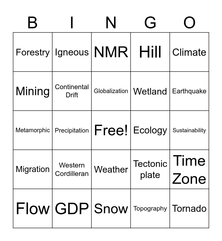 This bingo card has a free space and 105 words: Landform, Region, Climate, Current, Wind, Relief, Population, Immigration, Emigration, Push Factor, Pull Factor, Demography, Dependency Load, Working Population, Population Pyramid, NIR, NMR, PGR, Canadian Shield, Cordilleran, Prairies, Arctic, Atlantic Maritime, Pacific Maritime, Southeastern, Western Cordilleran, Earthquake, Hill, Latitude, Longitude, Tectonic plate, Topography, Volcano, Agriculture, Birth rate, Census, Climate change, Ethnicity, Globalization, GDP, Infrastructure, Migration, Resource, Mining, Fishing, Forestry, Wild Fire, Tornado, Hurricane, Mud Slide, Rural, Urban, Transportation, Erosion, Ecosystem, Habitat, Natural Disaster, Pollution, Renewable, Weather, Sustainability, Nation, City, Terrain, Capital, Nearness to Water, Elevation, Igneous, Metamorphic, Precipitation, Snow, Rain, Glacier, Glaciation, Island, Land Use, Mantle, Nonrenewable, Flow, Coniferous Forest, Boreal, Deciduous Forest, Tree Line, Continental Drift, Drought, Ecology, Geography, Hemisphere, Hydrosphere, Jet Stream, Lithosphere, Magma, Permafrost, Tsunami, Time Zone, Urban Sprawl, Crust, Core, Wetland, Windward, Leeward, Sediment, Climate Graph, Overpopulation and Refugee.