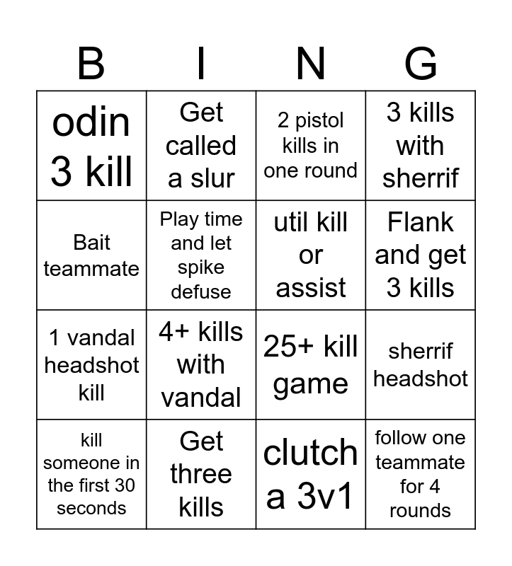 This bingo card has 16 words: Get three kills, sherrif headshot, 2 pistol kills in one round, odin 3 kill, 1 vandal headshot kill, Get called a slur, 25+ kill game, clutch a 3v1, Bait teammate, Play time and let spike defuse, kill someone in the first 30 seconds, 3 kills with sherrif, 4+ kills with vandal, Flank and get 3 kills, util kill or assist and follow one teammate for 4 rounds.