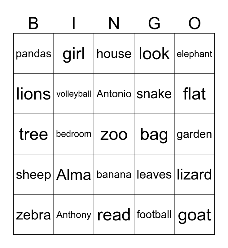 This bingo card has a free space and 24 words: Alma, Anthony, Antonio, zebra, elephant, pandas, lions, girl, bag, banana, snake, tree, leaves, lizard, volleyball, football, garden, house, flat, bedroom, goat, sheep, look and read.