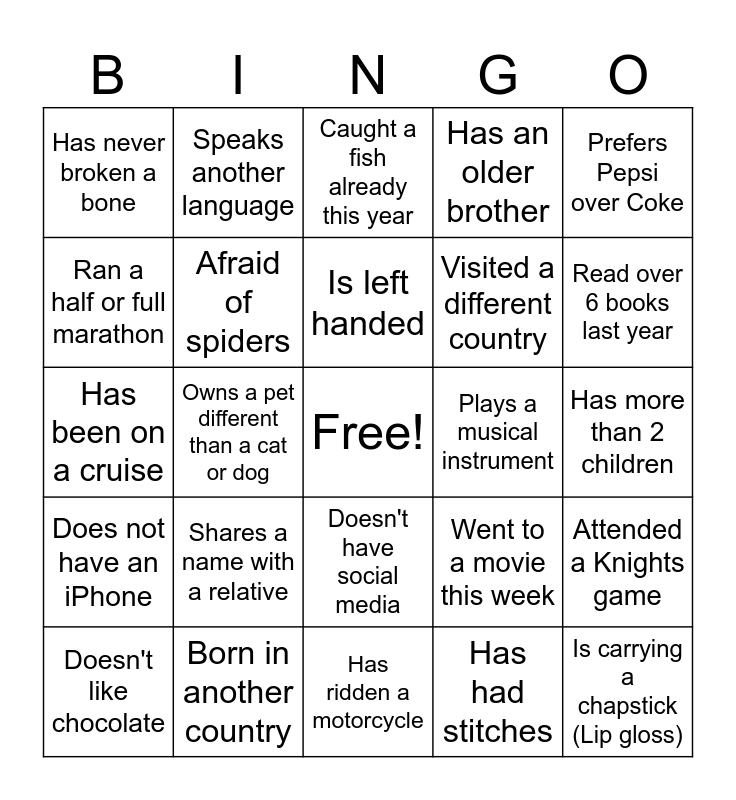 This bingo card has a free space and 24 words: Shares a name with a relative, Born in another country, Is left handed, Doesn't like chocolate, Prefers Pepsi over Coke, Has never broken a bone, Ran a half or full marathon, Speaks another language, Plays a musical instrument, Doesn't have social media, Visited a different country, Has been on a cruise, Went to a movie this week, Attended a Knights game, Afraid of spiders, Has had stitches, Has more than 2 children, Caught a fish already this year, Read over 6 books last year, Owns a pet different than a cat or dog, Is carrying a chapstick (Lip gloss), Does not have an iPhone, Has an older brother and Has ridden a motorcycle.