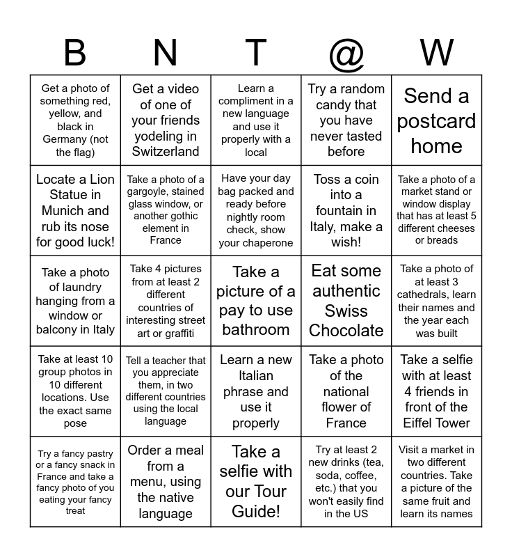 This bingo card has 25 words: Tell a teacher that you appreciate them, in two different countries using the local language, Take a selfie with our Tour Guide!, Have your day bag packed and ready before nightly room check, show your chaperone, Try a fancy pastry or a fancy snack in France and take a fancy photo of you eating your fancy treat, Send a postcard home, Get a photo of something red, yellow, and black in Germany (not the flag), Locate a Lion Statue in Munich and rub its nose for good luck!, Get a video of one of your friends yodeling in Switzerland, Eat some authentic Swiss Chocolate, Learn a new Italian phrase and use it properly, Toss a coin into a fountain in Italy, make a wish!, Take a photo of laundry hanging from a window or balcony in Italy, Take a photo of the national flower of France, Take a selfie with at least 4 friends in front of the Eiffel Tower, Take a photo of a gargoyle, stained glass window, or another gothic element in France, Visit a market in two different countries. Take a picture of the same fruit and learn its names, Take a photo of at least 3 cathedrals, learn their names and the year each was built, Learn a compliment in a new language and use it properly with a local, Take a photo of a market stand or window display that has at least 5 different cheeses or breads, Take 4 pictures from at least 2 different countries of interesting street art or graffiti, Take a picture of a pay to use bathroom, Order a meal from a menu, using the native language, Take at least 10 group photos in 10 different locations. Use the exact same pose, Try a random candy that you have never tasted before and Try at least 2 new drinks (tea, soda, coffee, etc.) that you won't easily find in the US.