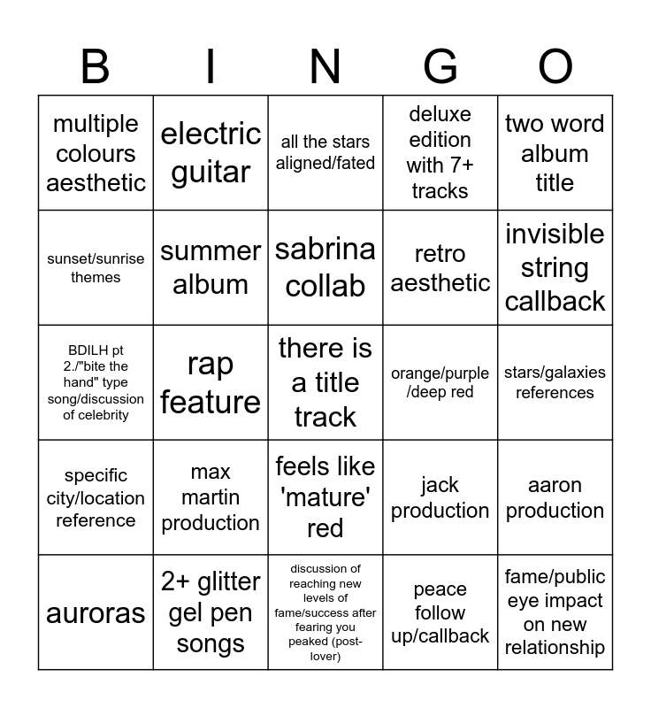This bingo card has a free space and 24 words: max martin production, 2+ glitter gel pen songs, sabrina collab, auroras, two word album title, multiple colours aesthetic, sunset/sunrise themes, electric guitar, orange/purple /deep red, feels like 'mature' red, retro aesthetic, BDILH pt 2./"bite the hand" type song/discussion of celebrity, jack production, aaron production, summer album, peace follow up/callback, stars/galaxies references, all the stars aligned/fated, invisible string callback, rap feature, fame/public eye impact on new relationship, specific city/location reference, deluxe edition with 7+ tracks and discussion of reaching new levels of fame/success after fearing you peaked (post-lover).