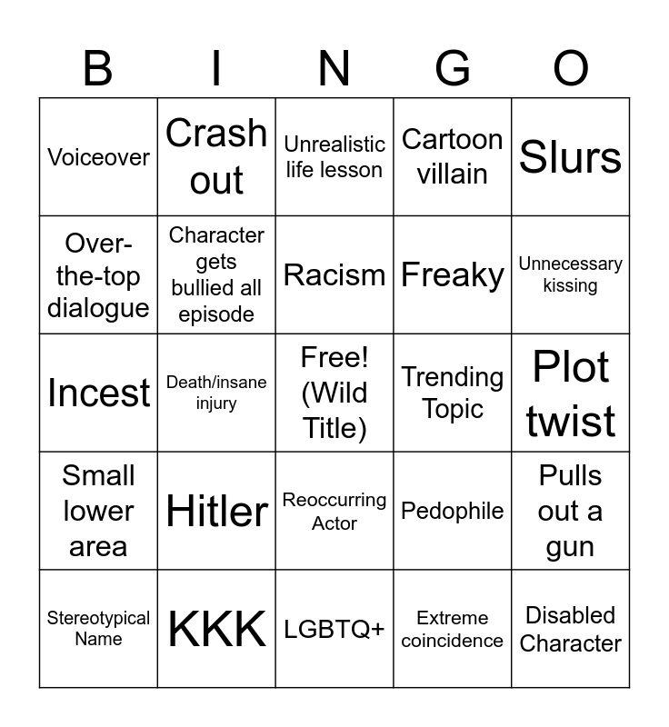 This bingo card has a free space and 24 words: Hitler, KKK, Racism, Stereotypical Name, Slurs, Voiceover, Over-the-top dialogue, Crash out, Trending Topic, Reoccurring Actor, Freaky, Incest, Pedophile, Pulls out a gun, Character gets bullied all episode, Extreme coincidence, Plot twist, Unrealistic life lesson, Unnecessary kissing, Death/insane injury, Disabled Character, Small lower area, Cartoon villain and LGBTQ+.