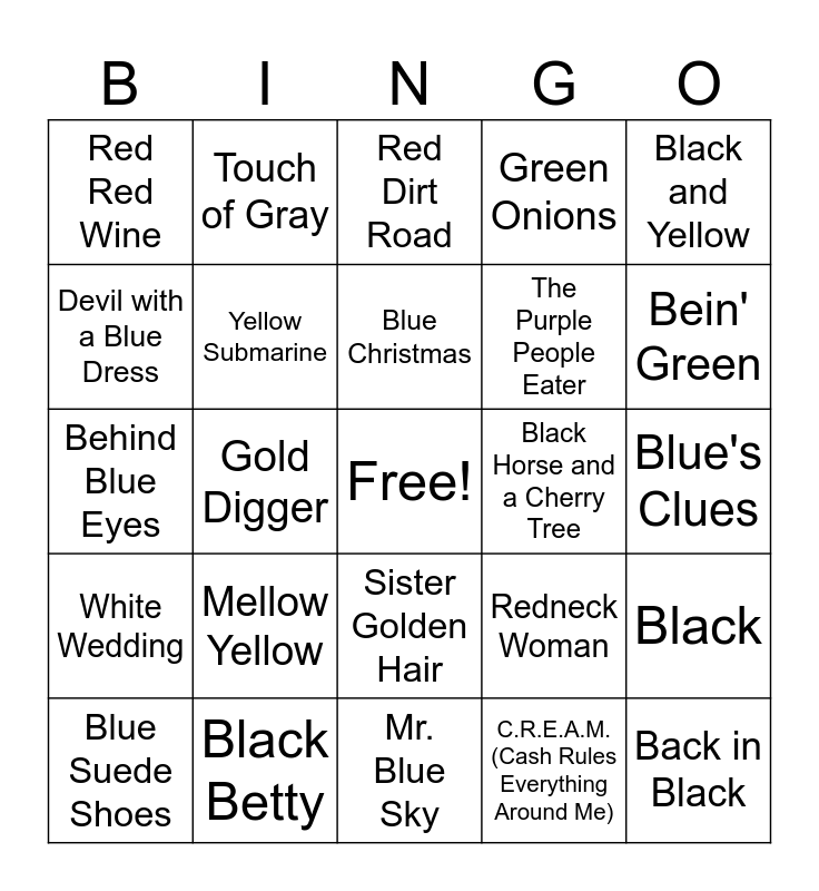 This bingo card has a free space and 55 words: Brown Eyed Girl, Blue Suede Shoes, Pretty Fly for a White Guy, Red Red Wine, Mr. Blue Sky, Purple Haze, Yellow Submarine, Pink, The Purple People Eater, White Wedding, Green Onions, Blue (Da Ba Dee), Yellow, Black or White, Crimson and Clover, Roadhouse Blues, Black and Yellow, Gold Digger, Amber, Back in Black, Black Horse and a Cherry Tree, Paint It, Black, Redneck Woman, Red Dirt Road, Little Red Corvette, Blue Christmas, C.R.E.A.M. (Cash Rules Everything Around Me), Black Velvet, Blue's Clues, Black, Rudolph the Red Nosed Reindeer, Purple Rain, Blue Moon, Big Yellow Taxi, Devil with a Blue Dress, Behind Blue Eyes, Black Hole Sun, White Wedding, Yellow Polka Dot Bikini, In the Navy, Touch of Gray, Bad, Bad, Leroy Brown, Blackbird, Pink Houses, Mellow Yellow, Black Betty, Black Magic Woman, Brown Sugar, White Room, Bein' Green, Blue Sky, Men in Black, Sound of Silver, Sister Golden Hair and Pink Pony Club.