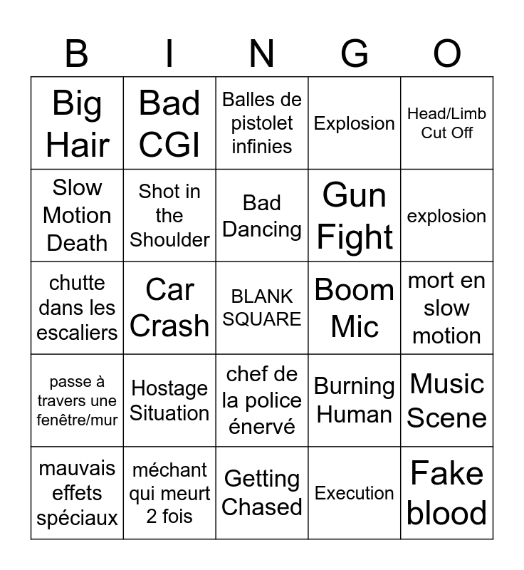 This bingo card has a free space and 48 words: No Reloading, Fake blood, Bag wig, Getting Chased, Hostage Situation, Saying Title In Movie, Bad CGI, Flashback, Slow Motion Death, Stutter, Shot in the Shoulder, Explosion, Music Scene, Burning Human, Long Scream, Bad Dubbing / Voiceover, Bad Dancing, Boom Mic, Stair Fall, Head/Limb Cut Off, Car Crash, Execution, Big Hair, Gun Fight, voiture en l'air, explosion, mauvais effets spéciaux, voiture faisant un vol plané, chef de la police énervé, passe à travers une fenêtre/mur, bagarre de bar, accent douteux, perche micro dans le champ, valise remplie de billets de banque/drogue, méchant qui meurt 2 fois, 3 moustaches à l'écran, titre dit dans le film, mort en slow motion, voix off, hotages, perruque de mauvaise qualité, Flashback, Balles de pistolet infinies, brushing volumineux, chutte dans les escaliers, membre amputé, danse nulle and nudité gratuite.