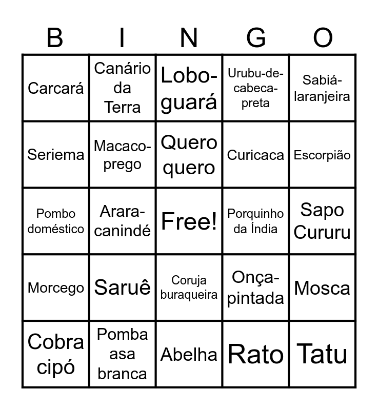 This bingo card has a free space and 31 words: Abelha, Arara-vermelha, Arara-canindé, Carrapato estrela, Carcará, Lobo-guará, Macaco-prego, Onça-pintada, Porquinho da Índia, Rato, Sapo Cururu, Tatu, Tucano, Maritaca-verde, Escorpião, Barata, Mosca, Saruê, Morcego, Coruja buraqueira, Sabiá-laranjeira, Capivara, Cobra cipó, Canário da Terra, Curicaca, Seriema, Urubu-de-cabeca-preta, Pombo doméstico, Pomba asa branca, Quero quero and Calango.
