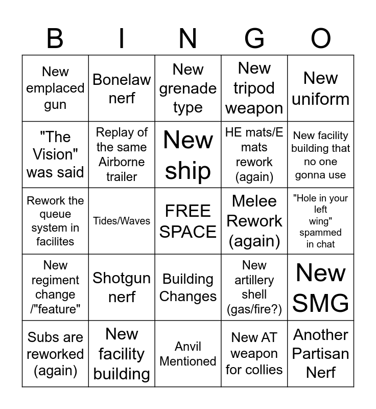 This bingo card has a free space and 24 words: Shotgun nerf, New facility building, New ship, Subs are reworked (again), New uniform, New emplaced gun, "The Vision" was said, Bonelaw nerf, Melee Rework (again), Building Changes, HE mats/E mats rework (again), Rework the queue system in facilites, New artillery shell (gas/fire?), New SMG, Replay of the same Airborne trailer, New AT weapon for collies, "Hole in your left wing" spammed in chat, New grenade type, New facility building that no one gonna use, Tides/Waves, Another Partisan Nerf, New regiment change /"feature", New tripod weapon and Anvil Mentioned.