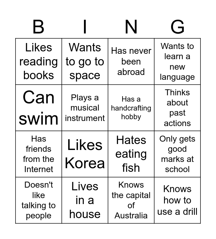 This bingo card has 16 words: Lives in a house, Only gets good marks at school, Has never been abroad, Likes reading books, Has friends from the Internet, Wants to go to space, Hates eating fish, Knows the capital of Australia, Can swim, Plays a musical instrument, Doesn't like talking to people, Wants to learn a new language, Likes Korea, Thinks about past actions, Has a handcrafting hobby and Knows how to use a drill.