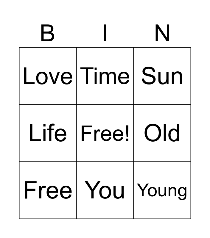 This bingo card has a free space and 9 words: Free, Sun, Time, Life, Love, Old, Young, Winter and You.