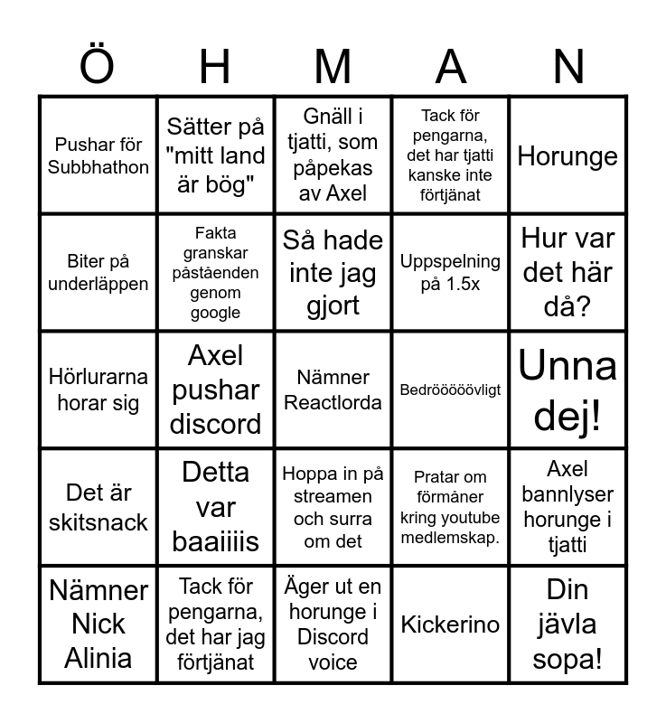 This bingo card has a free space and 43 words: Ingen Bryr sig!, Din jävla sopa!, Youtubeerino, Nämner Nick Alinia, Knäpper en Pilsner, Kickerino, Gnäll i tjatti, som påpekas av Axel, LMAO, Horunge, Tack för pengarna, det har jag förtjänat, Tack för pengarna, det har tjatti kanske inte förtjänat, Bedrööööövligt, Hoppa in på streamen och surra om det, Detta var baaiiiis, Suckar, Äger ut en horunge i Discord voice, Trueeeeeee, Hörlurarna horar sig, Ska vända kycklingen, Hur var det här då?, Sätter på "mitt land är bög", Twitcherino, Lyssna på haveristerna, Pushar för Subbhathon, Det är efterblivet!, Unna dej!, Jävla råtta!, Nu ska vi må bra!, Pratar om förmåner kring youtube medlemskap., Det är skitsnack, Bete diiig!, Axel bannlyser horunge i tjatti, Axel unbannar horunge från tjatti, Axel pushar discord, Asgarvar rakt ut!, Fitta, Gör en grimas, Så hade inte jag gjort, Biter på underläppen, Uppspelning på 1.5x, Säger "Bryr ihjäl sig", Fakta granskar påståenden genom google and Sarkasm flyger över huvudet på Tjatti!.