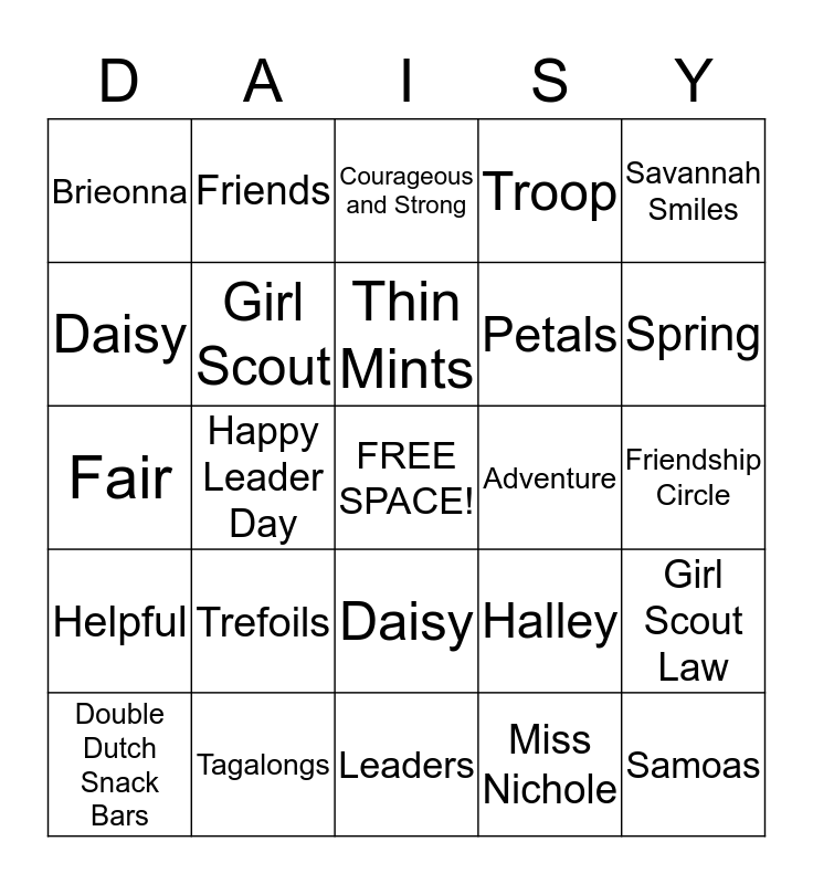 This bingo card has a free space and 24 words: Trefoils, Tagalongs, Thin Mints, Double Dutch Snack Bars, Savannah Smiles, Brieonna, Daisy, Friends, Adventure, Daisy, Petals, Fair, Halley, Girl Scout Law, Girl Scout, Miss Nichole, Friendship Circle, Courageous and Strong, Spring, Happy Leader Day, Samoas, Helpful, Troop and Leaders.