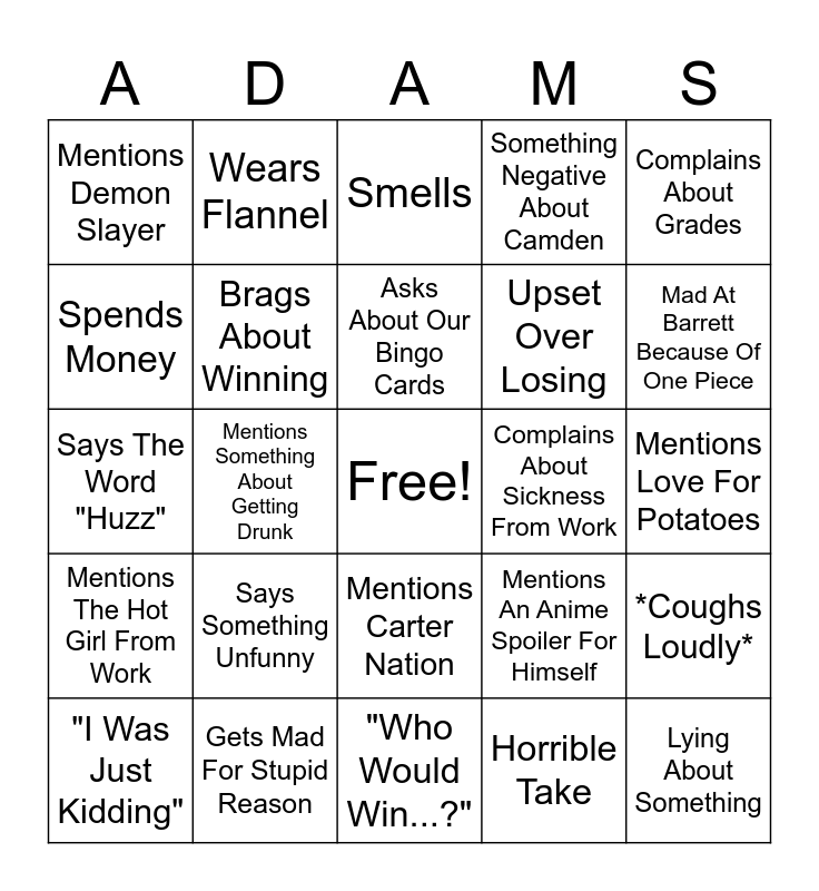 This bingo card has a free space and 44 words: "Likely Story No Granola", Lying About Something, "Shut Up", "I Was Just Kidding", Disagrees Purposefully, Horrible Take, Smells, Complains About His Life, Complains About Grades, Gets Mad For Stupid Reason, Something Negative About Camden, Complains About Sickness From Work, Mentions Carter Nation, Says Something Unfunny, "Would You Rather?", "Who Would Win...?", "Can I Play This Time", Says The Word "Huzz", Watches One Piece, Mad At Barrett Because Of One Piece, Wears Flannel, Mentions Boy Scouts Trips, Is On Phone During Conversation /Game, Mentions Demon Slayer, Hates On A Teacher, Mentions Love For Potatoes, *Shakes Head And Closes Eyes*, Mentions Lil Bob, Mentions An Anime Spoiler For Himself, Mentions The Hot Girl From Work, Says He'll Finish An Anime, *Coughs Loudly*, Mentions Being Single, Meatrides Gear 5 Luffy, Mentions Something About Getting Drunk, *Eats Pretzels In Class*, Picky Eater, Mentions Moms Wealth, Asks About Our Bingo Cards, Spends Money, Upset Over Losing, Quotes Inside Jokes, Brags About Winning and "I Hate You".