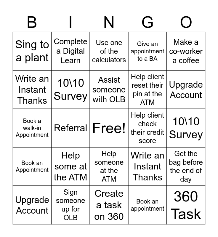 This bingo card has a free space and 24 words: Upgrade Account, Help some at the ATM, Assist someone with OLB, Book an appointment, Make a co-worker a coffee, Sing to a plant, Complete a Digital Learn, Use one of the calculators, Help client check their credit score, 10\10 Survey, Book a walk-in Appointment, 10\10 Survey, Write an Instant Thanks, Get the bag before the end of day, Write an Instant Thanks, Sign someone up for OLB, Create a task on 360, Give an appointment to a BA, Upgrade Account, Book an Appointment, Referral, Help someone at the ATM, Help client reset their pin at the ATM and 360 Task.