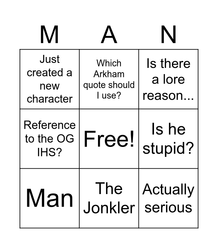This bingo card has a free space and 8 words: Is he stupid?, Is there a lore reason..., Which Arkham quote should I use?, Man, Just created a new character, Actually serious, Reference to the OG IHS? and The Jonkler.