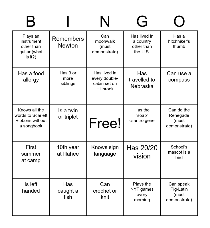 This bingo card has a free space and 37 words: Knows all 50 states in alphabetical order (must demonstrate), Has once owned a hamster (What was its name?), Can do a backflip, Has 3 or more siblings, School’s mascot is a bird, 10th year at Illahee, Has lived in every double-cabin set on Hillbrook, Speaks 2 or more languages (fluently), Has a hitchhiker's thumb, Native to Brevard, Is a twin or triplet, Has lived in a country other than the U.S., Can speak Pig-Latin (must demonstrate), Can do the Renegade (must demonstrate), Has a food allergy, First summer at camp, Can wiggle their ears (must demonstrate), Can moonwalk (must demonstrate), Knows sign language, Has the “soap” cilantro gene, Plays an instrument other than guitar (what is it?), Can use a compass, Is left handed, Can crochet or knit, Has developed a new hobby in the last year (must state what it is), Plays the NYT games every morning, Remembers Newton, Can drive stick, Has been sent to the principal’s office, Can state the national tree of their home country, Has run a half marathon or more, Has caught a fish, Knows all the words to Scarlett Ribbons without a songbook, Has won the camper-counselor tennis/pickleball tournament, Has 20/20 vision, Has travelled to Nebraska and Can spin a basketball on their finger.