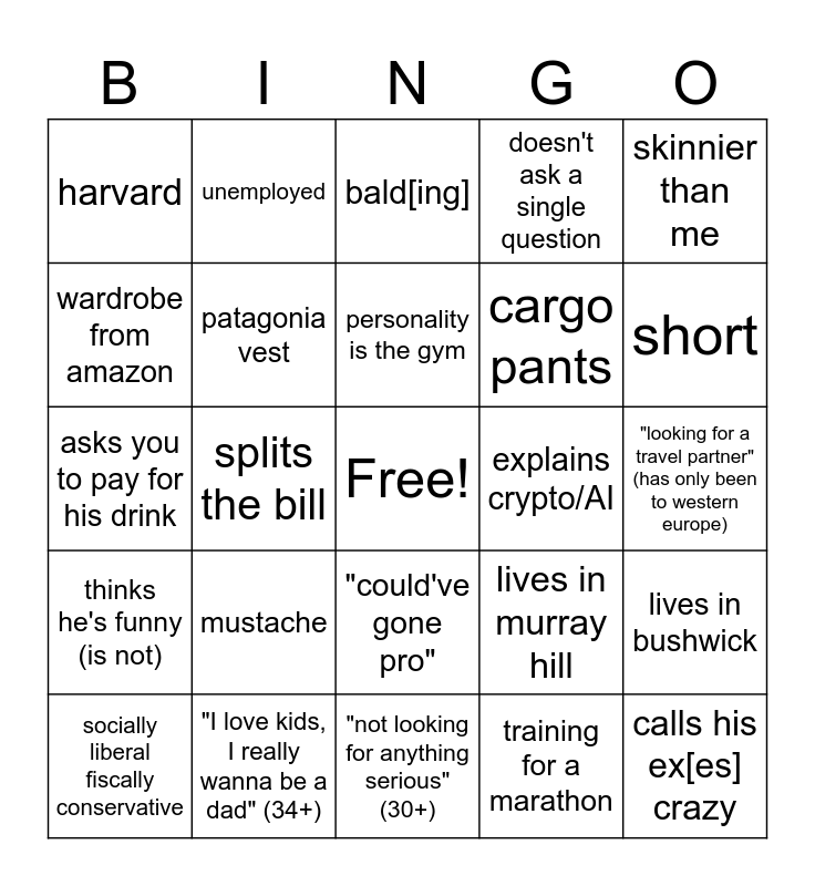 This bingo card has a free space and 24 words: mustache, "I love kids, I really wanna be a dad" (34+), personality is the gym, socially liberal fiscally conservative, skinnier than me, harvard, wardrobe from amazon, unemployed, explains crypto/AI, "could've gone pro", cargo pants, asks you to pay for his drink, lives in murray hill, lives in bushwick, patagonia vest, training for a marathon, "looking for a travel partner" (has only been to western europe), bald[ing], short, splits the bill, calls his ex[es] crazy, thinks he's funny (is not), doesn't ask a single question and "not looking for anything serious" (30+).