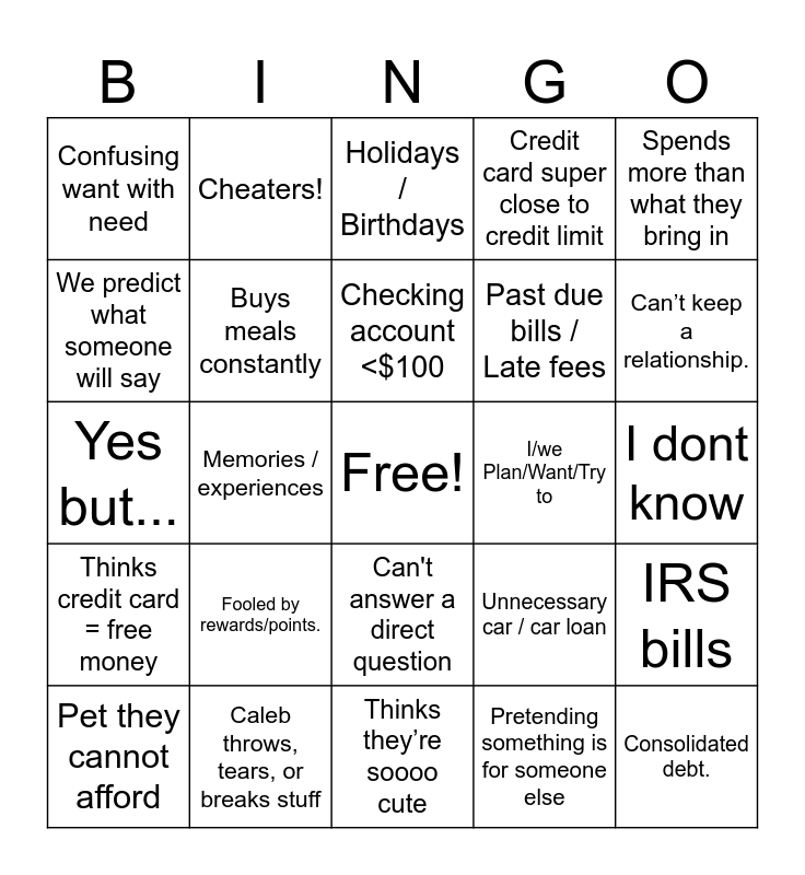 This bingo card has a free space and 36 words: It could be worse, Guest gives high Hammer score, Vapes, Buys meals constantly, Unnecessary car / car loan, Thinks credit card = free money, Checking account <$100, Caleb goes falsetto, Spends more than what they bring in, “I have to travel!” / Vacations, Memories / experiences, Credit card super close to credit limit, That’s why I’m here, I/we Plan/Want/Try to, Can’t keep a relationship., Confusing want with need, Takes money from family, Fooled by rewards/points., Consolidated debt., Holidays / Birthdays, I dont know, IRS bills, Caleb throws, tears, or breaks stuff, Pet they cannot afford, Thinks they’re soooo cute, Cheaters!, Yes but..., Credit One, Past due bills / Late fees, We predict what someone will say, Buy Now, Pay Later Service Provider, Payday loan, Pretending something is for someone else, Can't answer a direct question, Furniture / Mattresses and Doesn't take responsibility.