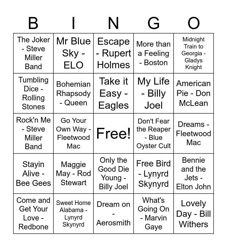 This bingo card has a free space and 41 words: September - Earth Wind and Fire, Rock'n Me - Steve Miller Band, Dancing Queen -Abba, Bohemian Rhapsody - Queen, Sweet Home Alabama - Lynyrd Skynyrd, Only the Good Die Young - Billy Joel, Take it Easy - Eagles, Heart of Glass - Blondie, Midnight Train to Georgia - Gladys Knight, Stayin Alive - Bee Gees, Go Your Own Way - Fleetwood Mac, More than a Feeling - Boston, Lovely Day - Bill Withers, Dreams - Fleetwood Mac, Don't Fear the Reaper - Blue Oyster Cult, Maggie May - Rod Stewart, 3 Little Birds - Bon Marley, The Joker - Steve Miller Band, Mama Mia - Abba, Escape - Rupert Holmes, Bennie and the Jets - Elton John, Hot Stuff - Donna Summers, Dream on - Aerosmith, My Life - Billy Joel, Take a Chance on Me - Abba, Superstition - Stevie Wonder, What's Going On - Marvin Gaye, Hotel California - The Eagles, American Pie - Don McLean, Let's Get it On - Marvin Gaye, Carry On Wayward Son - Kansas, Mr Blue Sky - ELO, Come and Get Your Love - Redbone, Somebody to Love - Queen, Free Bird - Lynyrd Skynyrd, Tumbling Dice - Rolling Stones, Heart of Gold - Niel Young, Movin Out - Billy Joel, Renegade - Styx, Feel Like Makin Love - Bad Company and Baba O'Riley - The Who.
