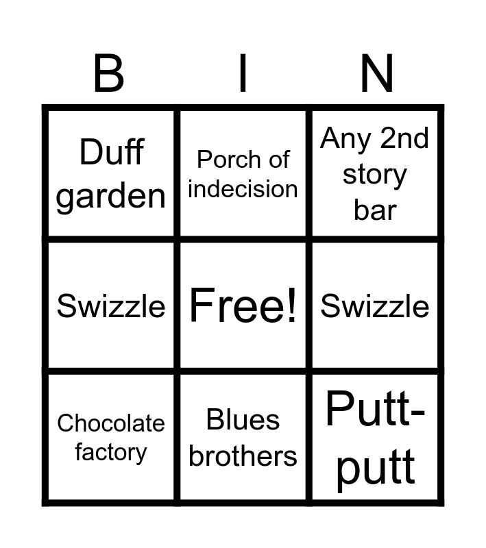 This bingo card has a free space and 8 words: Swizzle, Any 2nd story bar, Porch of indecision, Chocolate factory, Duff garden, Putt-putt, Swizzle and Blues brothers.