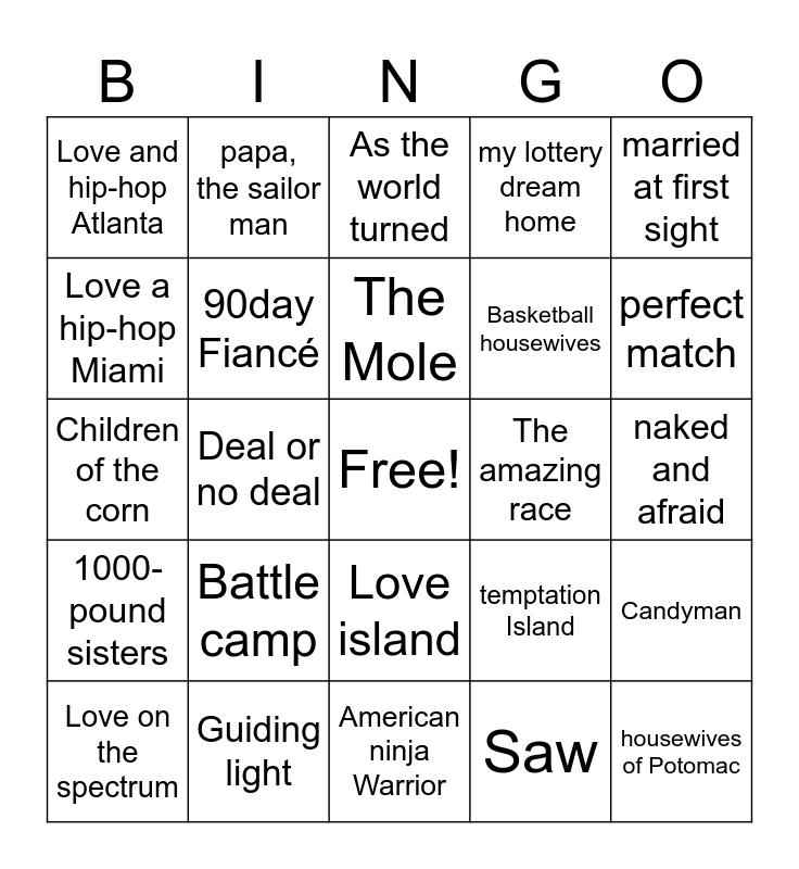 This bingo card has a free space and 39 words: Love is blind, The circle, Big Brother, 90day Fiancé, Love on the spectrum, Love island, The Mole, House wives of ATL, married at first sight, 1000-pound sisters, Deal or no deal, my lottery dream home, housewives of Potomac, naked and afraid, The amazing race, Battle camp, The real housewives of Beverly Hills, Love and hip-hop Atlanta, ready to love, temptation Island, Love a hip-hop Miami, American ninja Warrior, Basketball housewives, perfect match, Love Jones, Final destination, Big Brother house and me, Falling in love, Crazy in love, papa, the sailor man, Barney, SpongeBob, As the world turned, Guiding light, Saw, Chucky the movie, Candyman, Children of the corn and Little shop of horror.