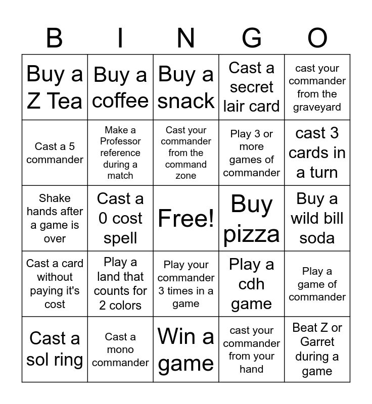 This bingo card has a free space and 24 words: Cast a sol ring, Play a land that counts for 2 colors, Cast your commander from the command zone, cast your commander from your hand, cast your commander from the graveyard, Buy a Z Tea, Buy a coffee, Buy a snack, Buy pizza, Buy a wild bill soda, Shake hands after a game is over, Make a Professor reference during a match, Play a cdh game, Play a game of commander, Cast a 5 commander, Cast a mono commander, Win a game, Cast a secret lair card, cast 3 cards in a turn, Cast a card without paying it's cost, Cast a 0 cost spell, Play your commander 3 times in a game, Play 3 or more games of commander and Beat Z or Garret during a game.