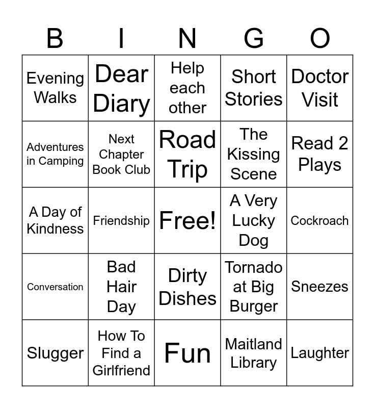 This bingo card has a free space and 24 words: Bad Hair Day, How To Find a Girlfriend, Road Trip, Slugger, Doctor Visit, Evening Walks, Adventures in Camping, Dear Diary, A Very Lucky Dog, Dirty Dishes, The Kissing Scene, A Day of Kindness, Tornado at Big Burger, Sneezes, Next Chapter Book Club, Maitland Library, Cockroach, Help each other, Read 2 Plays, Friendship, Laughter, Conversation, Short Stories and Fun.