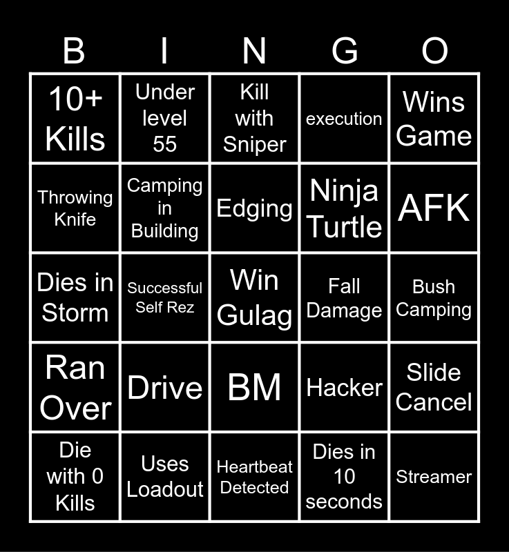 This bingo card has a free space and 24 words: Drive, Uses Loadout, Edging, Die with 0 Kills, Wins Game, 10+ Kills, Throwing Knife, Under level 55, Fall Damage, BM, Ninja Turtle, Dies in Storm, Hacker, Slide Cancel, Camping in Building, Dies in 10 seconds, Bush Camping, Kill with Sniper, AFK, Successful Self Rez, Streamer, Ran Over, execution and Heartbeat Detected.
