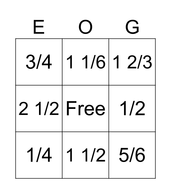 This bingo card has a free space and 10 words: 1 1/2, 1 2/3, 3/4, 5/6, 2 1/2, 1/4, 1 1/6, 2, 1/2 and 3.