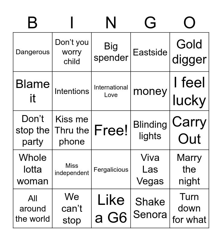 This bingo card has a free space and 66 words: Just Dance, Let’s get it started, Club can’t handle me, Marry the night, Poker face, I gotta feeling, Don’t you worry child, Hotel room service, International Love, Memories, Fergalicious, Cooler than me, Carry Out, Gold digger, Lip Gloss, Blame it, Kiss me Thru the phone, Dangerous, Money money money, money, Miss independent, Whole lotta woman, Eastside, Cheap thrills, Right Round, Gangsta's Paradise, The motto, Jump jive an wail, Turn down for what, Wiggle, All around the world, Lean on, If I had $1000000, Billionaire, Viva Las Vegas, We can’t stop, higher love, Don’t stop the party, Shake Senora, One dance, Intentions, Rockabye, Blinding lights, Perm, Ramblin Gamblin Man, The gambler, I feel lucky, Rolling in the deep, Rasputin, Sin City, Can’t be tamed, Disturbia, Calabria 2007, Mr.Saxobeat, We no speak Americano, in the Ayer, all I do is win, Mony Mony, Big spender, Like a G6, All Shook up, Leaving Las Vegas, Aint that a kick in the Head, Night Life, Hey Pachuco! and Born To Be Alive.