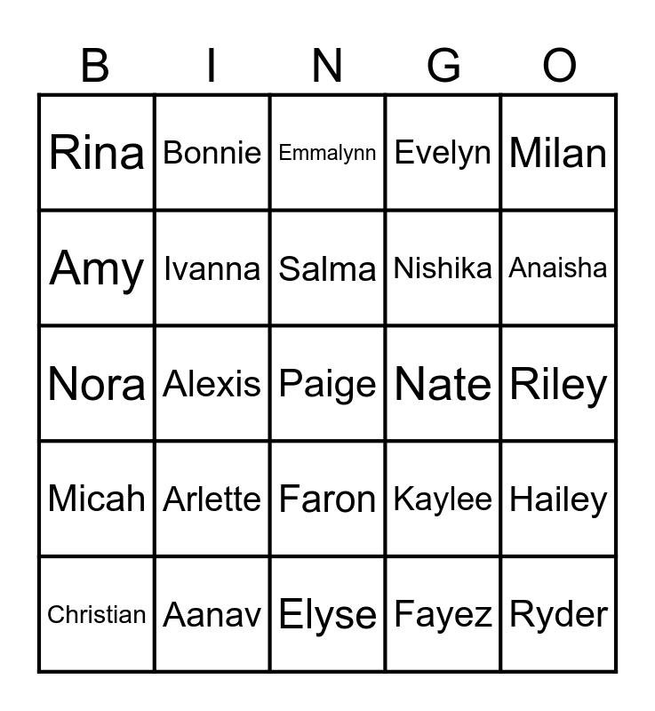 This bingo card has 25 words: Arlette, Elyse, Salma, Christian, Milan, Rina, Amy, Bonnie, Nate, Faron, Nishika, Nora, Kaylee, Hailey, Ivanna, Ryder, Riley, Emmalynn, Anaisha, Alexis, Paige, Aanav, Micah, Evelyn and Fayez.