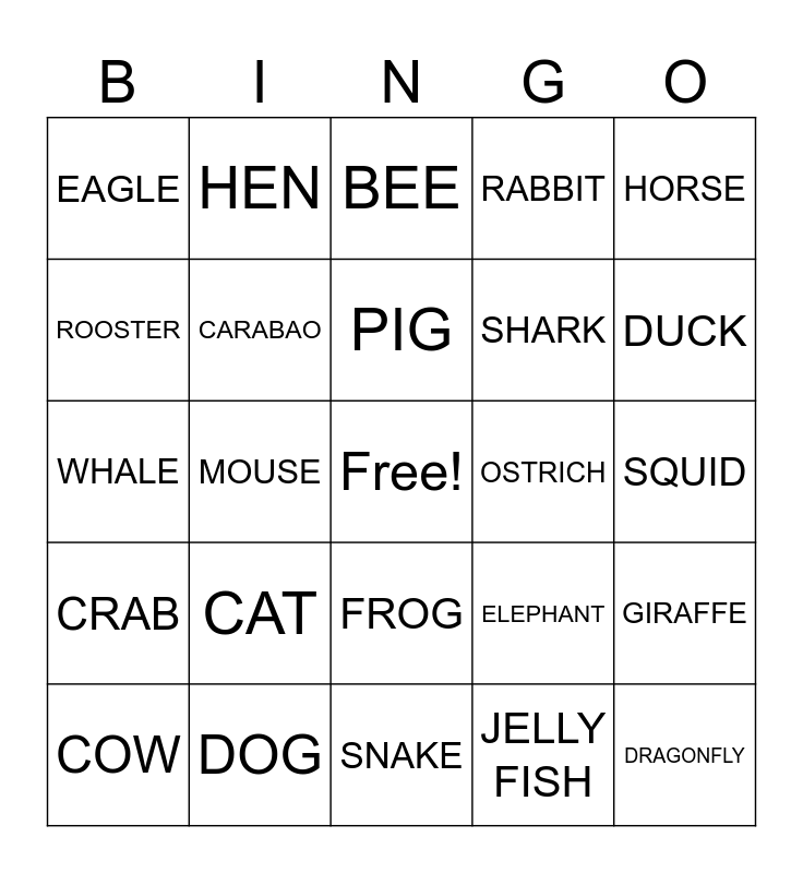This bingo card has a free space and 24 words: CAT, DOG, PIG, COW, HORSE, EAGLE, ROOSTER, HEN, OSTRICH, FROG, SHARK, WHALE, ELEPHANT, GIRAFFE, CARABAO, JELLY FISH, SQUID, BEE, DUCK, MOUSE, DRAGONFLY, CRAB, RABBIT and SNAKE.