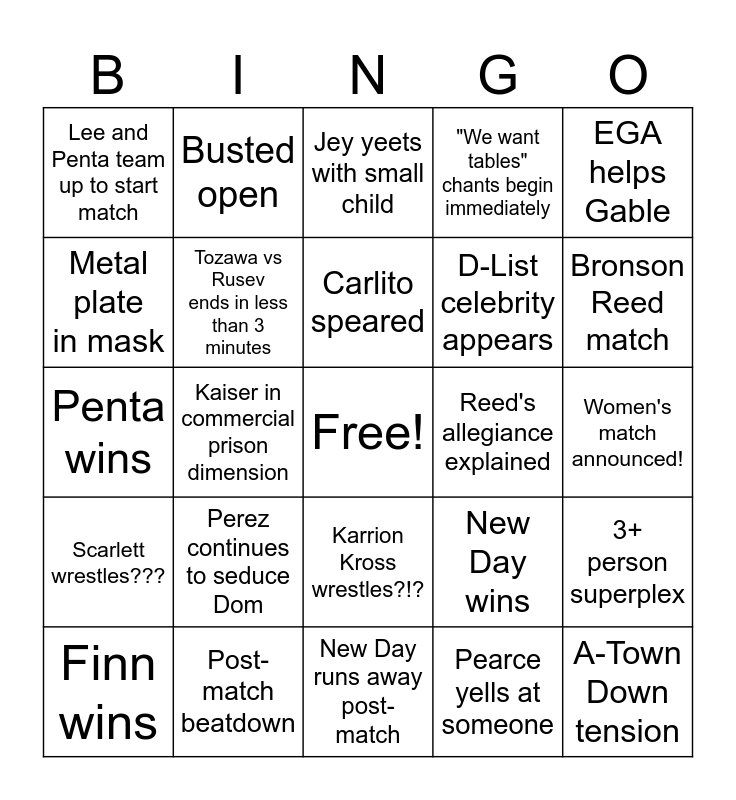 This bingo card has a free space and 24 words: Perez continues to seduce Dom, Post-match beatdown, Carlito speared, Finn wins, EGA helps Gable, Lee and Penta team up to start match, Metal plate in mask, Busted open, Reed's allegiance explained, Karrion Kross wrestles?!?, D-List celebrity appears, Penta wins, New Day wins, 3+ person superplex, Tozawa vs Rusev ends in less than 3 minutes, Pearce yells at someone, Women's match announced!, Jey yeets with small child, Bronson Reed match, Kaiser in commercial prison dimension, A-Town Down tension, Scarlett wrestles???, "We want tables" chants begin immediately and New Day runs away post-match.