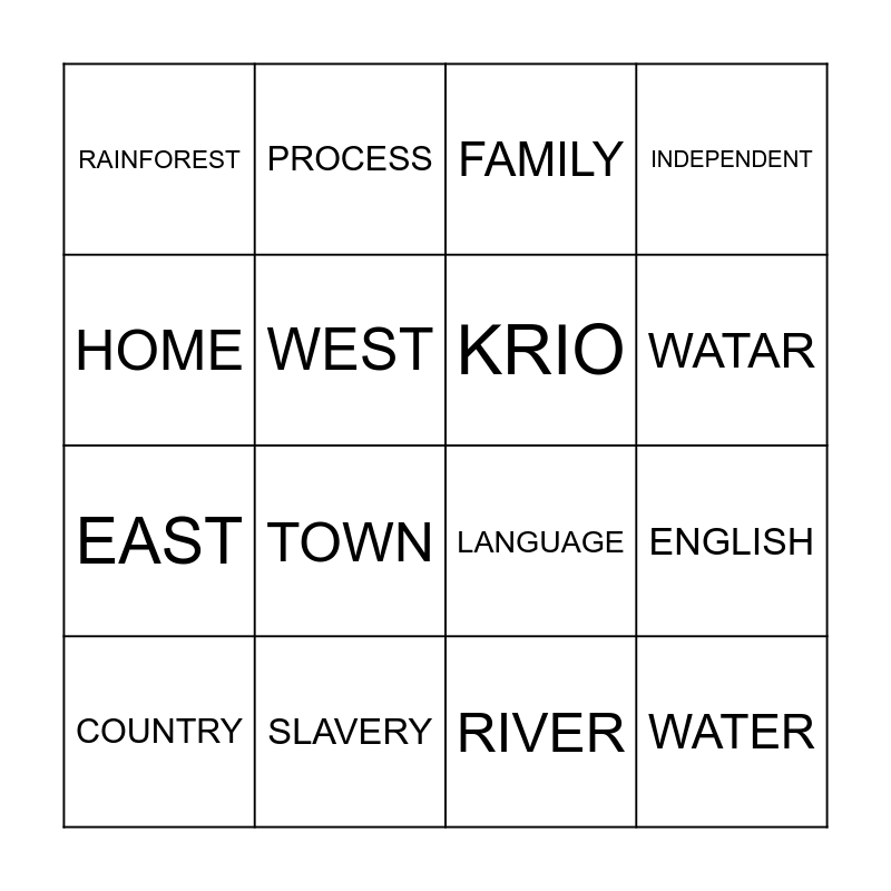 This bingo card has 36 words: SIERRA LEONE, MAP, DIASPORA, KRIO, FREETOWN, WATER, WATAR, SCHOOL, HOME, TROPICAL, ENGLISH, INDEPENDENT, ANGLOPHONY, SLAVERY, TOWN, RAINFOREST, AFRICA, CONTINENTS, COUNTRY, FAMILY, RIVER, FLAG, WORLD, NOW, NAW, PROCESS, LANGUAGE, SOUTH, EAST, WEST, NORTH, MOUNTAIN, ISLAND, LAKE, COCOA and OCEAN.