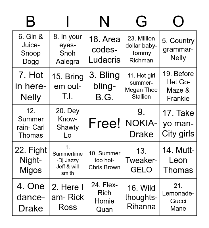 This bingo card has a free space and 24 words: 1. Summertime -Dj Jazzy Jeff & will smith, 2. Here I am- Rick Ross, 3. Bling bling- B.G., 4. One dance- Drake, 5. Country grammar- Nelly, 6. Gin & Juice- Snoop Dogg, 7. Hot in here-Nelly, 8. In your eyes- Snoh Aalegra, 9. NOKIA- Drake, 10. Summer too hot- Chris Brown, 11. Hot girl summer- Megan Thee Stallion, 12. Summer rain- Carl Thomas, 13. Tweaker- GELO, 14. Mutt- Leon Thomas, 15. Bring em out- T.I., 16. Wild thoughts- Rihanna, 17. Take yo man- City girls, 18. Area codes- Ludacris, 19. Before I let Go- Maze & Frankie, 20. Dey Know- Shawty Lo, 21. Lemonade- Gucci Mane, 22. Fight Night- Migos, 23. Million dollar baby- Tommy Richman and 24. Flex- Rich Homie Quan.