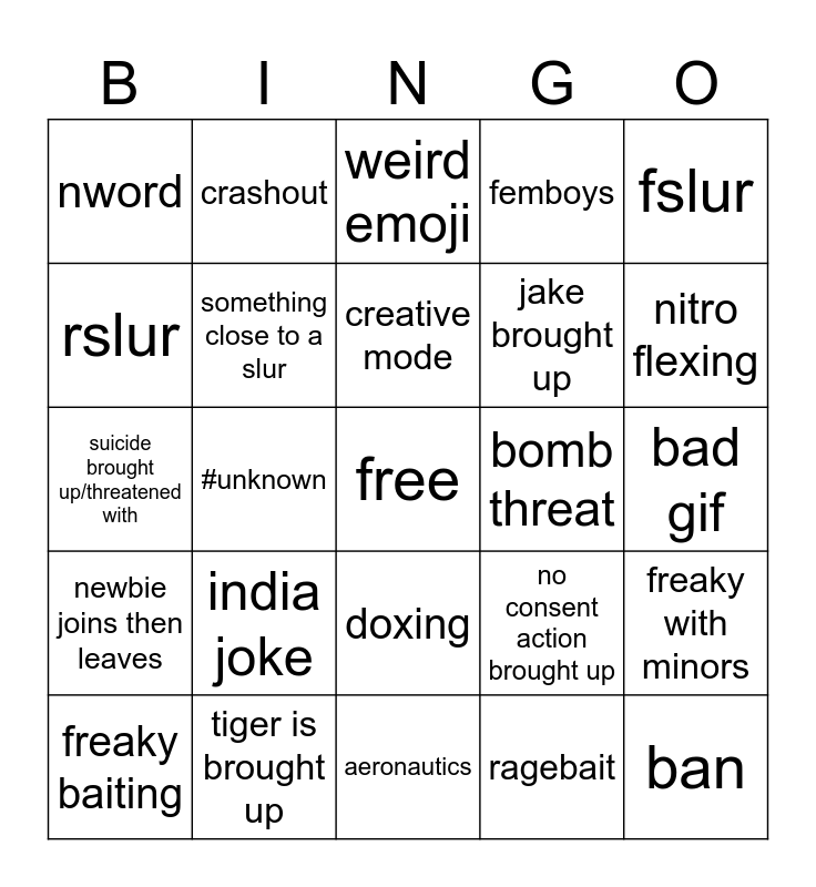 This bingo card has a free space and 24 words: india joke, tiger is brought up, creative mode, freaky baiting, fslur, nword, rslur, crashout, bomb threat, doxing, jake brought up, suicide brought up/threatened with, no consent action brought up, freaky with minors, something close to a slur, ragebait, bad gif, weird emoji, nitro flexing, #unknown, ban, newbie joins then leaves, femboys and aeronautics.