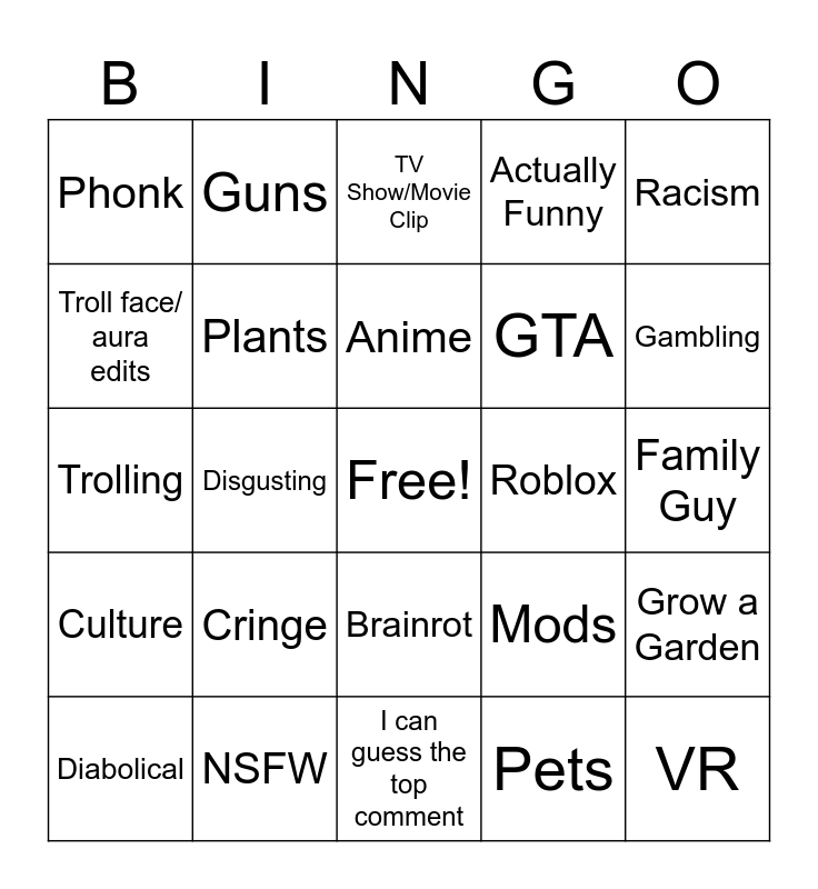 This bingo card has a free space and 24 words: Cringe, NSFW, Anime, Diabolical, Racism, Phonk, Troll face/ aura edits, Guns, Roblox, Brainrot, GTA, Trolling, Mods, Grow a Garden, Plants, Pets, Family Guy, TV Show/Movie Clip, Gambling, Disgusting, VR, Culture, Actually Funny and I can guess the top comment.