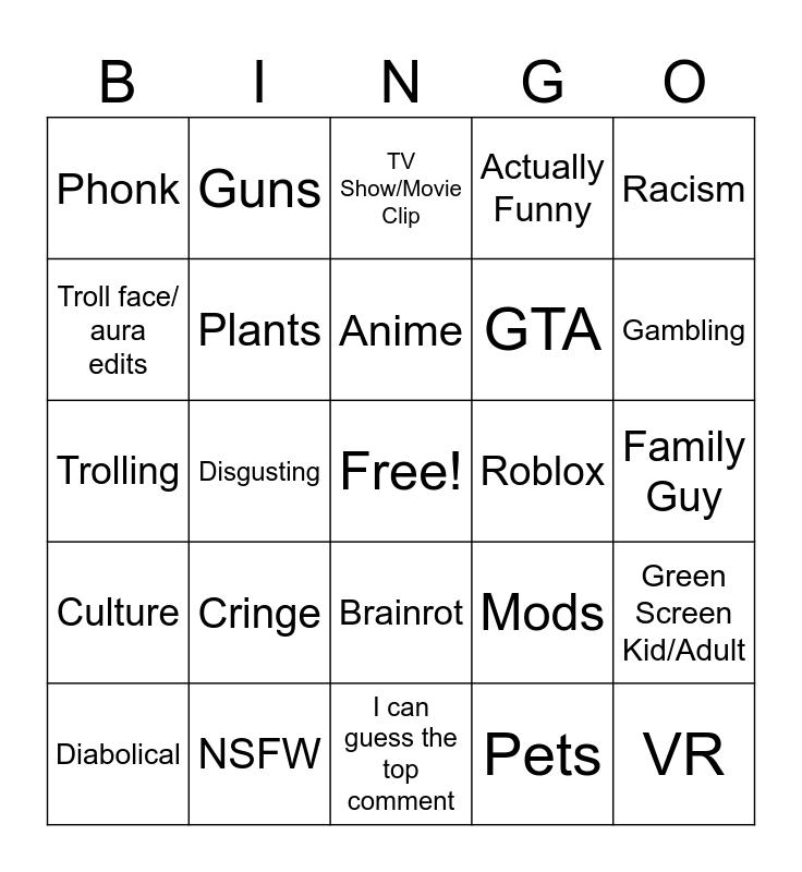 This bingo card has a free space and 24 words: Cringe, NSFW, Anime, Diabolical, Racism, Phonk, Troll face/ aura edits, Guns, Roblox, Brainrot, GTA, Trolling, Mods, Green Screen Kid/Adult, Plants, Pets, Family Guy, TV Show/Movie Clip, Gambling, Disgusting, VR, Culture, Actually Funny and I can guess the top comment.