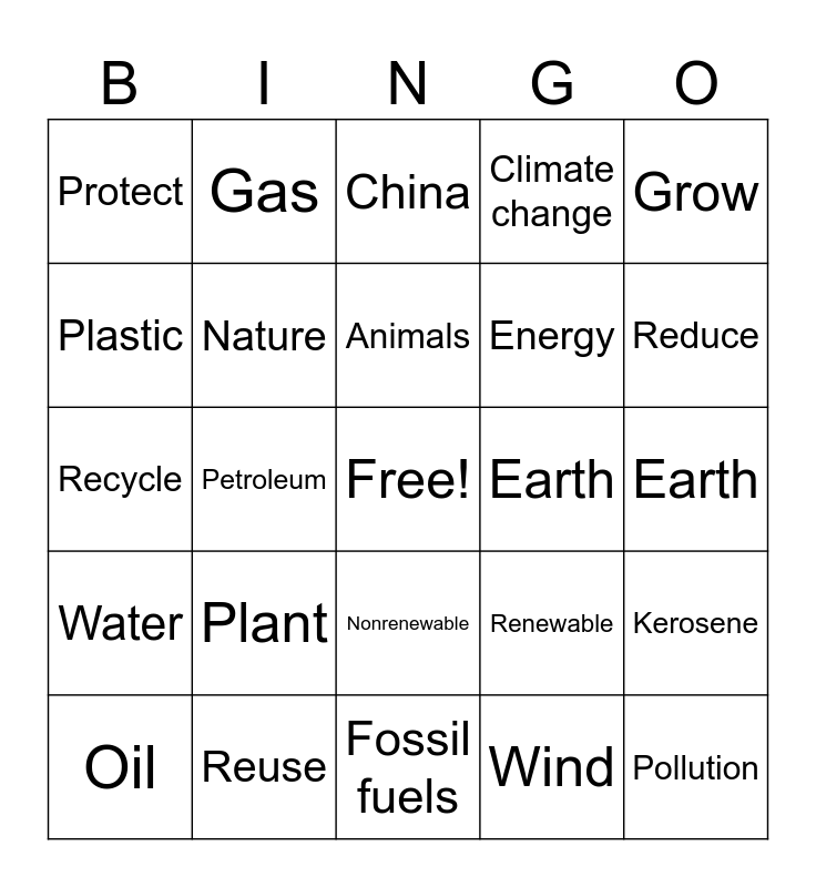 This bingo card has a free space and 34 words: Solar power, Wind, Sun, Hydropower, Water, Nature, Grow, Oil, Gas, Coal, Animals, China, Fracking, Tree, Earth, Reduce, Reuse, Recycle, Plant, Renewable, Nonrenewable, Clean, Protect, Earth, Fossil fuels, Pollution, Climate change, Sustainable, Energy, Plastic, Bamboo, Petroleum, Kerosene and Acid rain.
